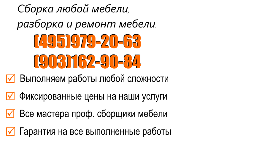 Профессиональный коллектив, состоящий из квалифицированных сборщиков мебели, проживающих в Москве с гражданством - Россия. Не задействуем третьих лиц - каждый заботится о своей положительной репутации. С заказчиком напрямую общается сам исполнитель. Для взаимопонимания принимает заявки старший мастер.